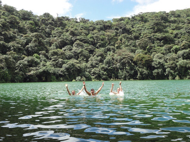 Nach zwei Tagen machen wir uns mit dem Bus auf in Richtung Norden zu Costa Ricas aktivstem Vulkan, El Arenal. Rote Lava sieht man seit 3 Jahren zwar nicht mehr; der spitz zulaufende Vulkan ist trotzdem ein Magnet für die Augen. Mit Claudia und Silke mache ich eine Wanderung auf den erloschenen Nebenkrater Cerro Chato inklusive einem Bad im Kratersee.