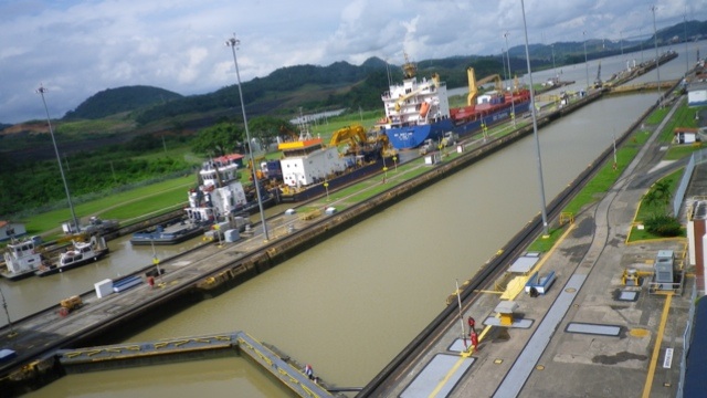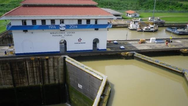 Am nächstem Tag mache ich einen Ausflug zum Panamakanal, zu einer der drei Schleusenanlagen in Miraflores. In insgesamt 3 Schleusenanlagen werden die durchquerenden Schiffe 26m auf Höhe des Gatunsees angehoben und auf der anderen Ozeanseite wieder abgesenkt. Ich habe Glück und sehe die letzten Schiffe, die für den Vormittag geplant sind, auf ihrem Weg durch die Schleuse.