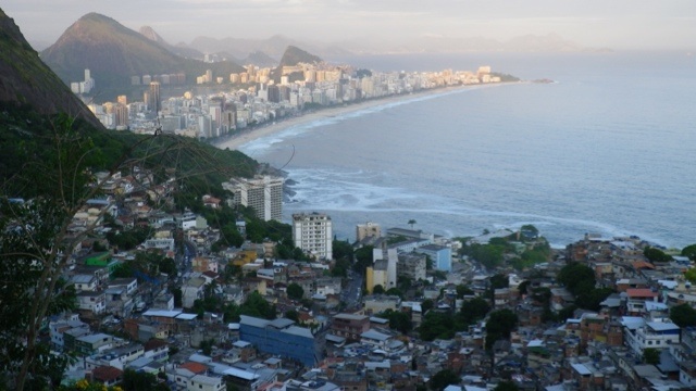 Mit Axel, dem Hausbesitzer, der auch als Tourguide arbeitet, mache ich eine Wanderung auf einen der zwei Berggipfel, die südlich des Strandes von Leblon emporragen. Der Weg dorthin ist abenteuerlich. Zuerst geht es mit dem Bus in die Favela Vidigal. Vom Eingang der Favela nehmen wir Motorradtaxis, die uns zum oberen Teil der Favela bringen. In einer unauffälligen Gasse beginnt der Weg; wenn man ihn nicht kennt, ist er nicht zu finden. Nach einer Stunde steilem Anstieg erreichen wir den Gipfel und werden mit einem unglaublichem Ausblick belohnt. Vor uns breitet sich der Strand von Leblon und Ipanema aus; man sieht den herzförmigen Süsswassersee und den Christus Redentor. Auch die Ausmasse der Favela Rocinha, der größten Favela Lateinamerikas kann man von hier erahnen.