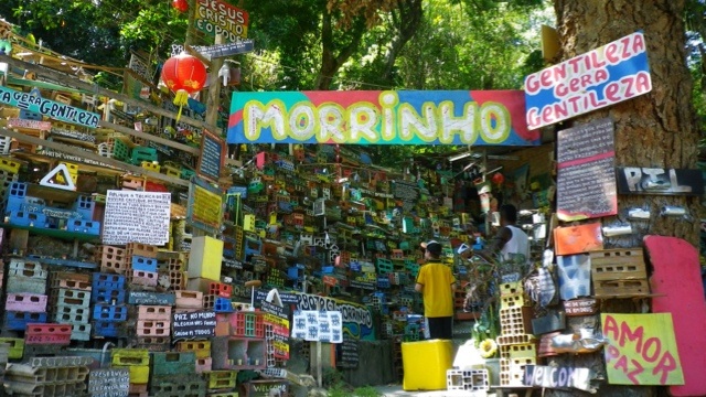 Ich besichtige das Projeto Morrinho in der Favela- ein Projekt, das vor 20 Jahren von Kindern als Spiel begonnen wurde. Sie stahlen in der Nacht Ziegelsteine und bauten sich damit ihre Mini-Favela, in der sie dann mit Playmobilfiguren spielten. Ein brasilianischer Journalist wurde auf ihr Werk aufmerksam und es folgten mehrere Einladungen zu Kunstmessen und – wettbewerben. Die Jungen aus der Favela reisten unter anderem nach Barcelona, Venedig und New York und erbauten dort ihre Favela mit Elementen der jeweiligen Stadt. Heute unterstützen sie mit den Einnahmen aus den Besichtigungen eine Filmschule für Kinder aus der Favela.