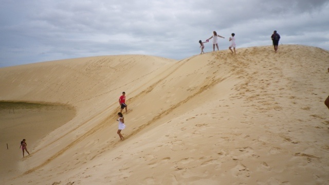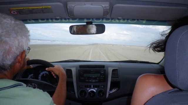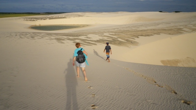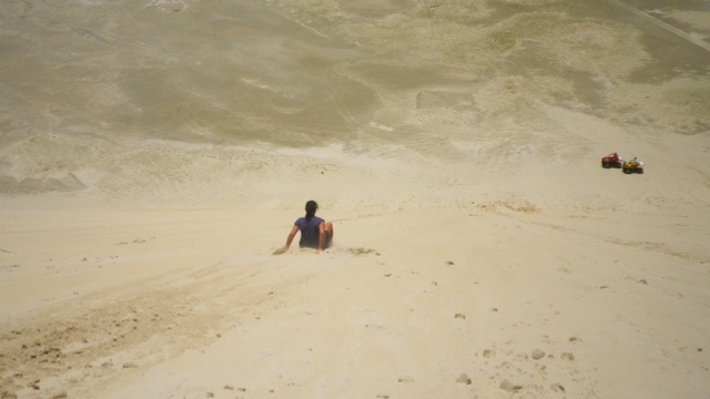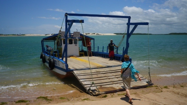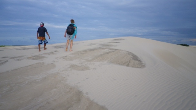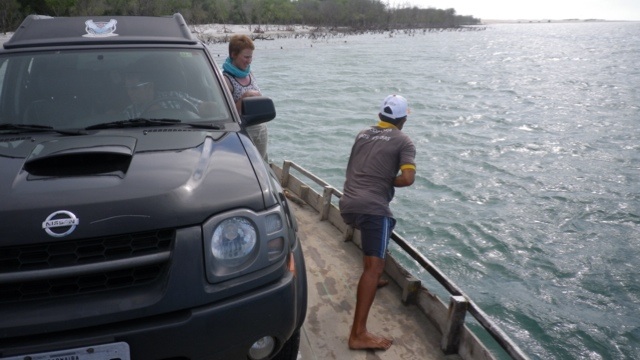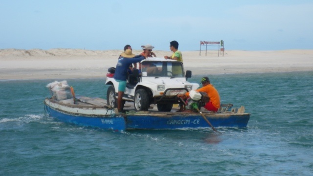 Nach weiteren zähen Verhandlungen buchen wir einen Weitertransport nach Jericoacoara, einem idyllischen Ort inmitten von Dünen im Bundesstaat Ceará. Der Transport mit George ist abenteuerlich. Bis Camocim fahren wir auf der Strasse, dort bringt uns eine Autofähre in die Dünen. Wir machen Halt an einer Düne, die den Sandboardern gehört und probieren es auch gleich selbst aus. An der Lagoa Paraiso machen wir Mittagspause. Am Strand entlang düsen wir danach Jericoacoara entgegen, nur einmal müssen wir noch die handbetriebene Fähre nehmen.