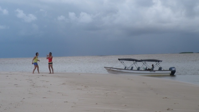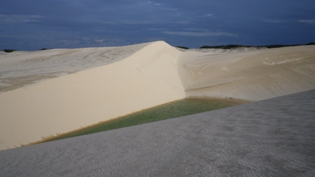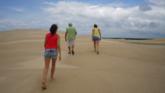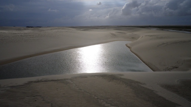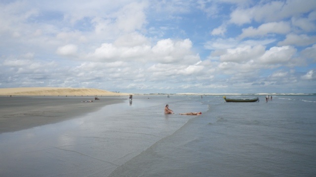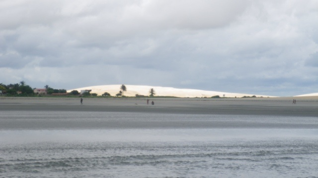 Lençois, auf deutsch Bettlaken, ist die einzige Wüste Brasiliens und weltweit die einzige Wüste mit Wasserbecken. Der erste Ort, Barreirinhas, ist sehr enttäuschend. Am nächsten Morgen fahren wir auf dem Rio Preguiças bis zu seiner Mündung ins Meer. Von dem Ort Caburé organisieren wir uns ein Boot, das uns nach Atins bringt. Unsere Ankunft im Hafen von Atins ist abenteuerlich – außer Sand ist da nix und ich bin froh, dass sich mein Rollkoffer schnell zum Rucksack umbauen läßt. Wir fragen uns durch zur gerade eröffneten Pousada eines Berliners, die uns Frankie aus São Luis empfohlen hat. Da in Atins aber weder Handys noch Internet funktionieren, haben wir unsere Ankunft nicht ankündigen können. Und es kommt wie es kommen muss- die Pousada ist geschlossen. Die Dorfbewohner zeigen sich aber sehr hilfsbereit und quartieren uns bei Tante Rita ein.
