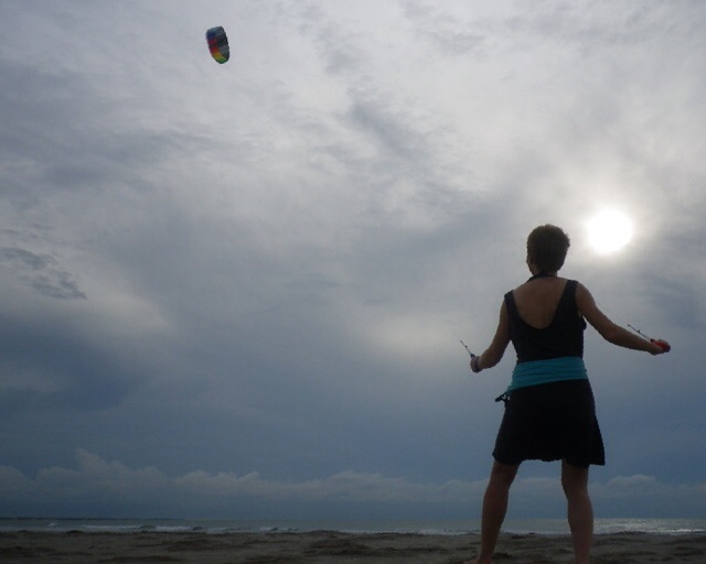 Beatrice mit ihrem Drachen am Strand.